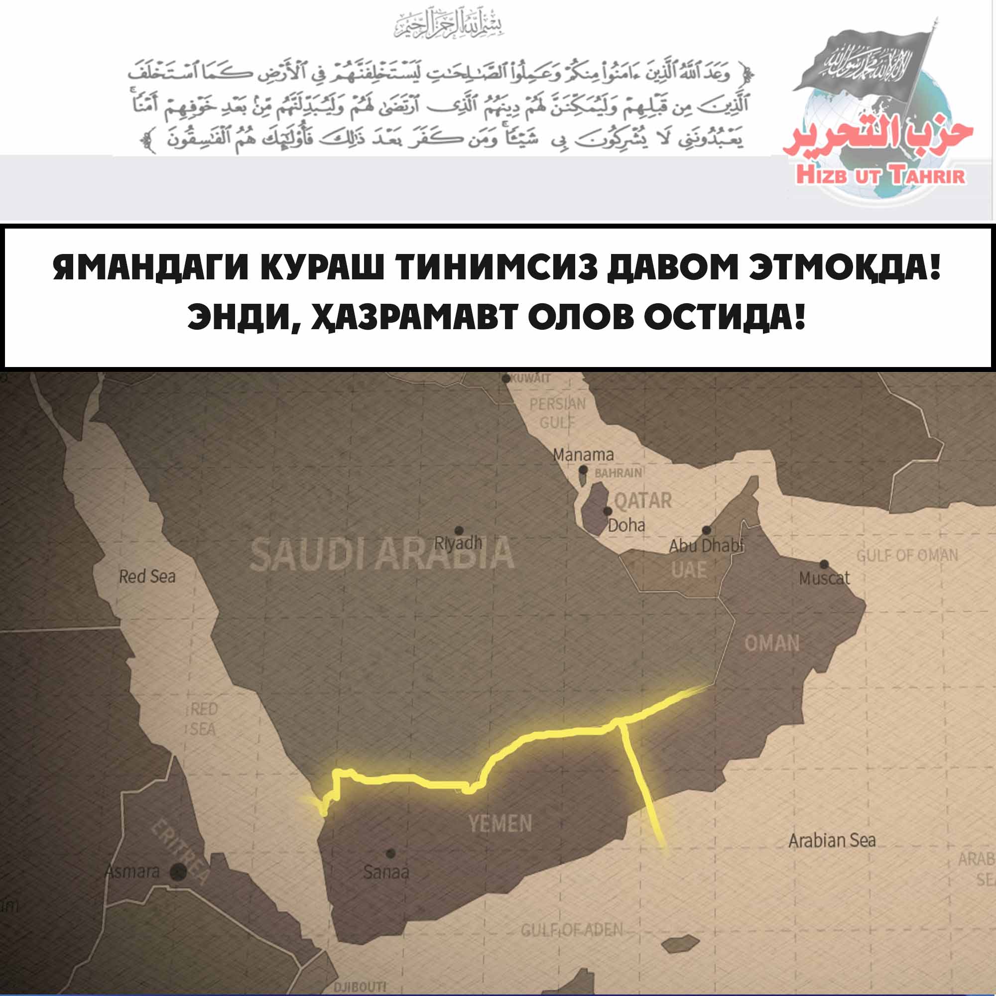 Демак, бу баённомадан кўриниб турибдики, Ҳазрамавт устидаги кураш зоҳирда минтақавий (Саудия-Амирликлар) кураши, аслида эса, Ғарб (Британия-Америка) курашидир. Дарҳақиқат, ўзининг улкан бойлиги сабабли, шунингдек, 193 минг квадрат километр катта майдони туфайли Яманнинг энг муҳим минтақаларидан бири ҳисобланган Ҳазрамавтдаги бу курашни маҳаллий қўллар олиб бормоқда. Бироқ икки томоннинг бирортаси ҳам халқ манфаатлари ёки эҳтиёжлари ҳақида қайғурмаяпти. Қайғурганда эди, уруш шу кунгача давом этмасди. Уруш Яманнинг мусулмон ёшлари қонини қуритмоқда. Шу боис, биз «Ҳазрамавт» ва «Ҳазрамавт нефти» каби шиорларга – худди жанубдаги одамлар жануб бойликларига ва потенциалларига алданиб қолишгани каби – алданиб қолмаслигимиз керак. Чунки устимиздан ҳукм юритаётганлар бу курашнинг ниқобли ўйинчиларидир. Улар ечимни таъминлай олмайдилар. Чунки улар ечимнинг эмас, муаммонинг бир бўлагидирлар.